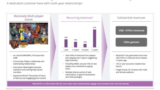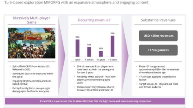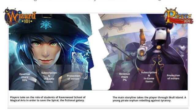 Let’s start with some of the less optimistic news. Pirate101 has a much smaller playerbase and generates a much smaller stream of revenue than Wizard101. Slide 3 states that Wizard101 has made 375 million USD in revenues since launch, good for a 93% revenue share (slide 2). Thus, one can easily derive that Pirate101 has made between 25 and 30 million USD in revenue, which amounts to about 7% of KI revenue (slide 2). Furthermore, similar findings hold regarding number of accounts. Pirate101 has under 10 million accounts, while Wizard101 has over 50 million.