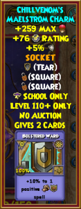 • For a balanced storm build I recommend putting 2 6% pierce jewels on Aphrodite’s Storm of Thorns. Pet with storm dealer, storm giver, storm assailant, spell proof, Critical striker and pain giver. Dragon hat, boots and ring +18 critical. Flygob’s Medallion amulet , sky captain hook wand, Malistaire’s Cloak of Flux Robe, Paradox deck. Storm ghulture mount. It should give you 163% damage, 39% resist, 33% accuracy, 20% stun resist ,850 critical rating, 25% pierce, 100 pip chance.