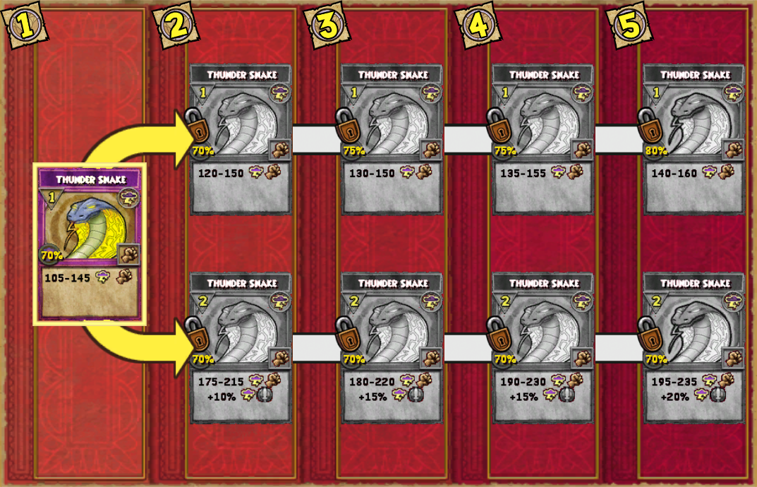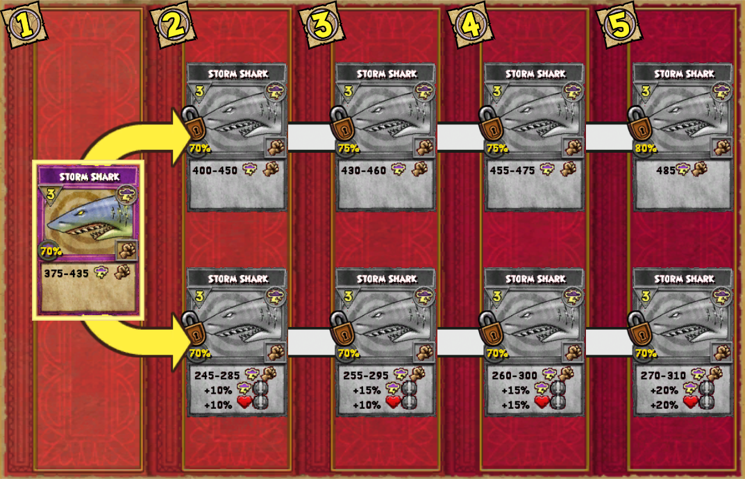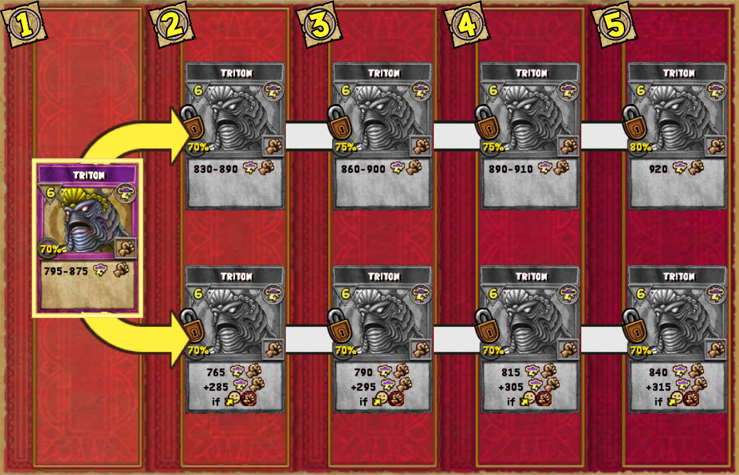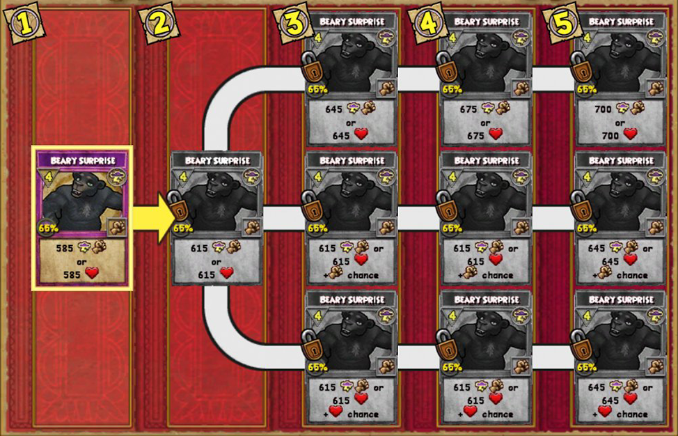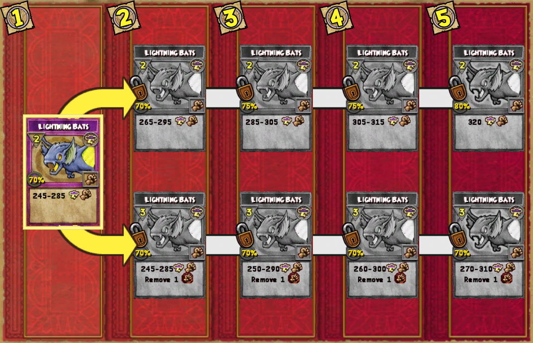 Top Path: Damage, heal, and pip cost all increased with each tier.