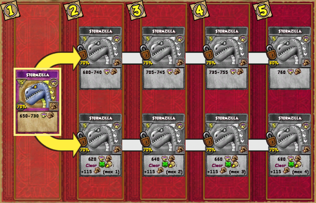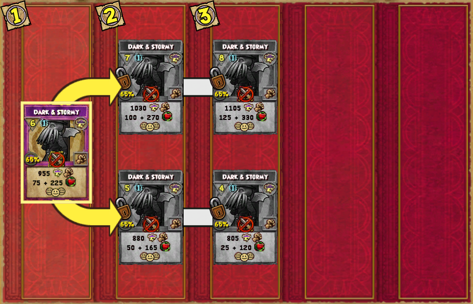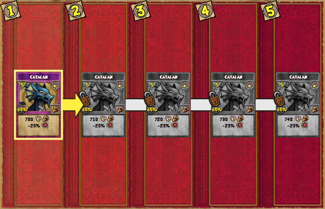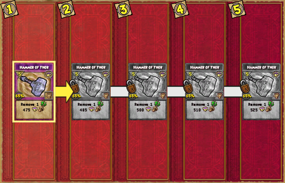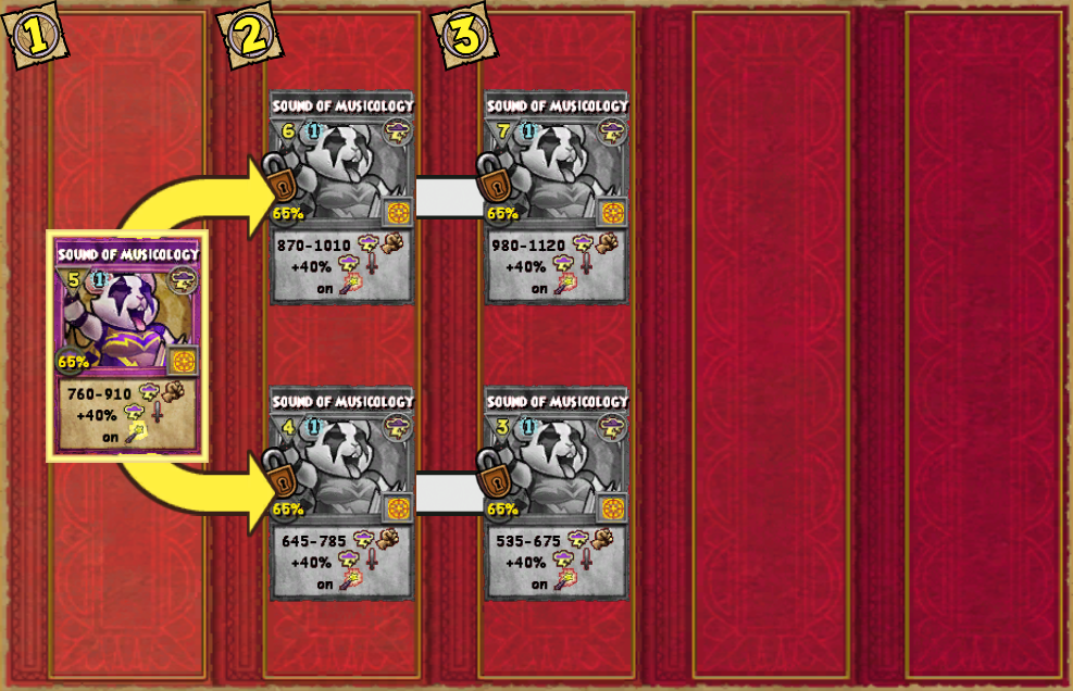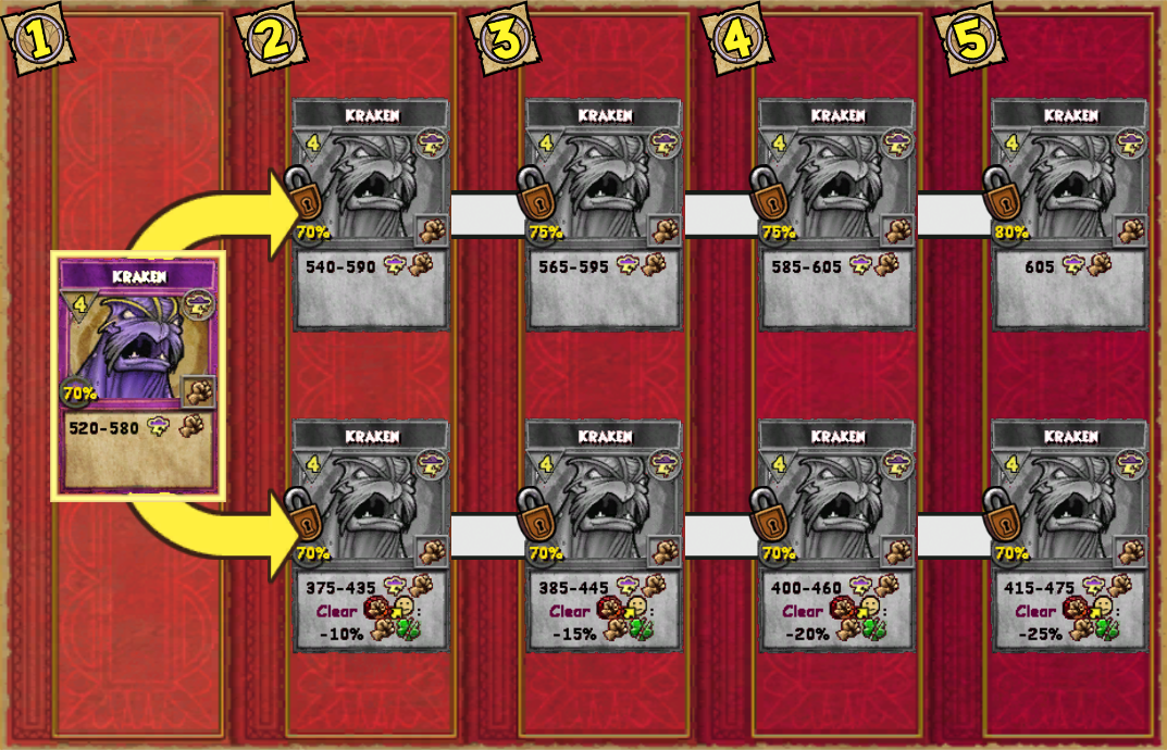 Top Path: Damage, heal, and pip cost all increased with each tier.